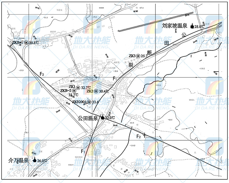 根據抽水試驗實測涌水量、水溫結合鉆孔與區內斷裂構造的相對位置分析,靠近F2則相對富水,水溫亦升高;且隨著含水層(公田斷裂破碎帶)埋深的增大,揭露的地下水溫也增高;地下水溫度與含水層埋深有關,也和地下水賦水空間與深部熱源溝通程度有關。